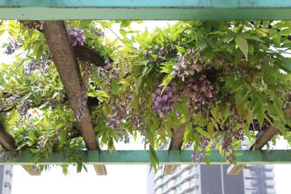だんだん陽射しが強くなり始めるこの時期。藤色の房が風に揺れて輝きます。蜜を求めに何匹も虫が飛んできて、日吉の恵みのおすそ分けです。