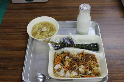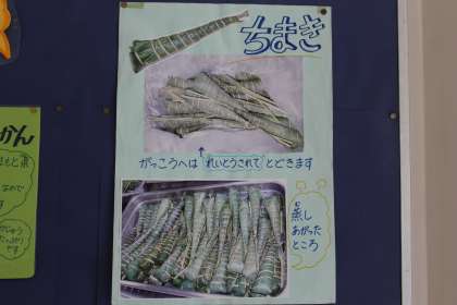今日は行事献立。5月5日のこどもの日にちなんで「ちまき」が登場しました。かしわ餅は普段でも結構お店にありますが、ちまきが出回るのはこの時期に限られるので、あまりなじみがないのか、笹の葉の包みをむいて食べるのに、ちょっと悪戦苦闘気味の子どもたちでした。