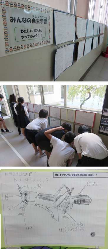 今、職員室前の廊下には、各クラスからの自主学習したノートが張り出されています。