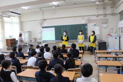 今日は、朝の時間に1年生の各教室で、子どもの安全をもまるための、子ども110番の家のことや「5つの約束をまもろうね」をお話ししていただきました。