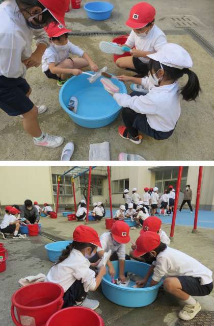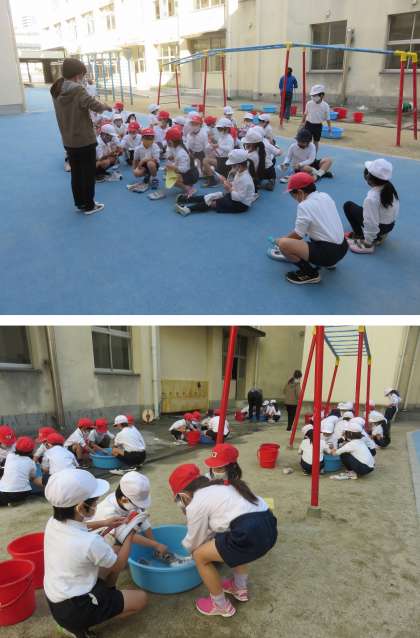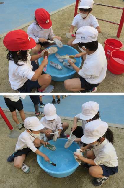 1年生が、中庭で『上ぐつ』を洗っていました。