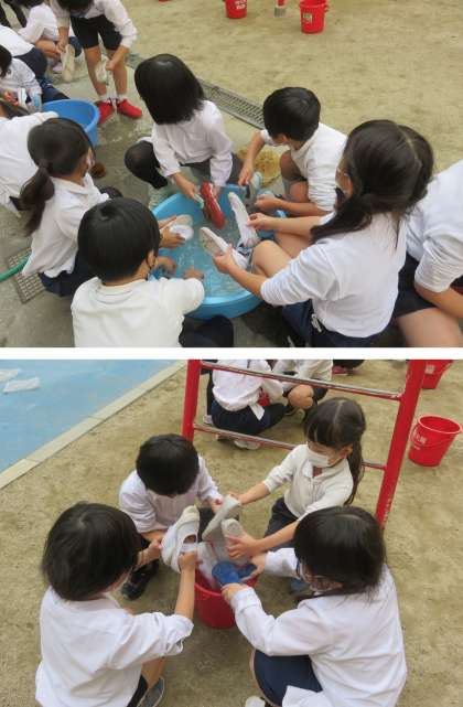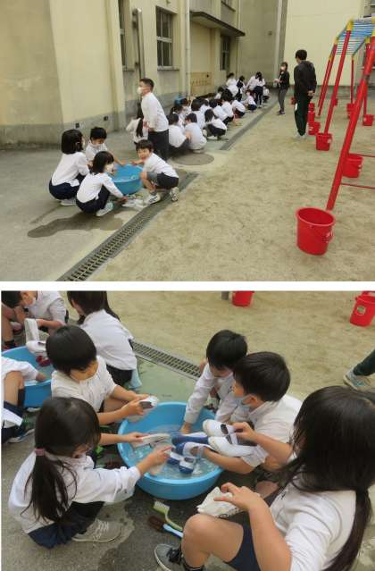 今日も1年生の別のクラスが上ぐつを洗っていました。