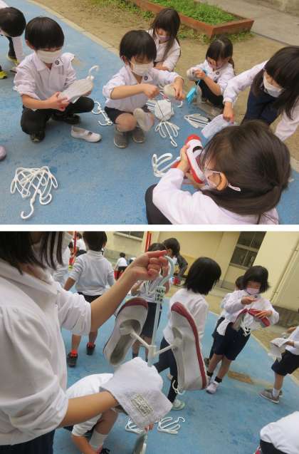 ハンガーにかけた後は、教室の自分の机の横につるして月曜日まで干すそうです。