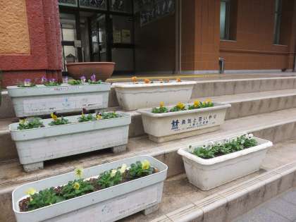 管理作業員さんが、昨日玄関周りの花壇やプランターに花を植えてくれました。