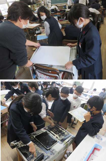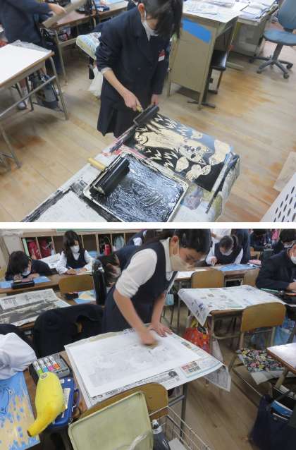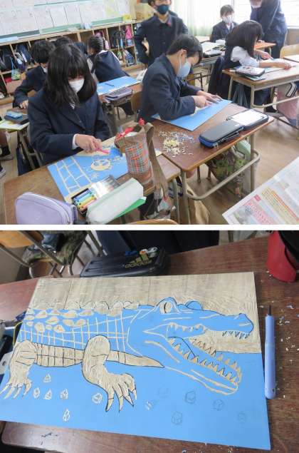 インクをつけて刷り上がりを確かめたり、一生懸命に彫っていたりする子もいました。
