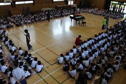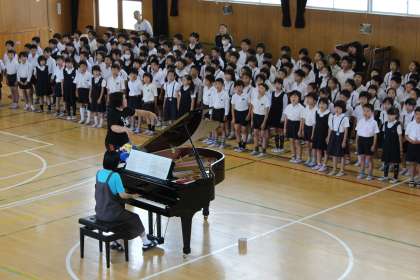 講堂の真ん中にピアノを設けて、それを全校児童が囲む形に集まりました。