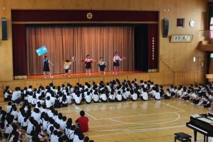 集会委員会の寸劇や「にゃんちゅう」の出現で、会場が和やかになったあと、1・2年生は「ちょうちょう」、3・4年生は「春の小川」、5・6年生は「花のまわりで」を順に歌いました。