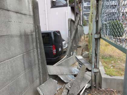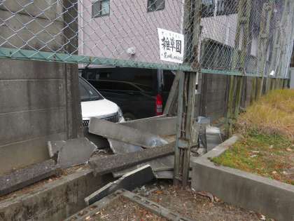 コインパーキングと接しているため、車が壁にぶつかったために崩落したのではないか・・と思われますが、詳しい原因については分かりません。