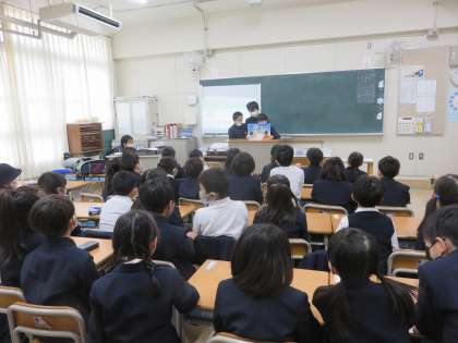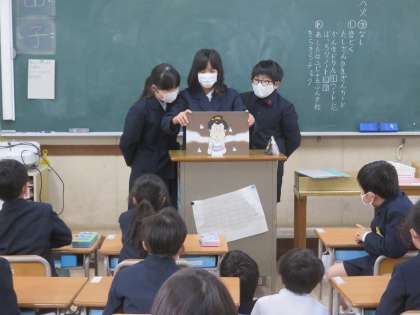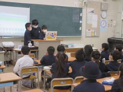 図書委員会では、低学年の教室へ行き、『絵本の読み聞かせ』の活動をしています。