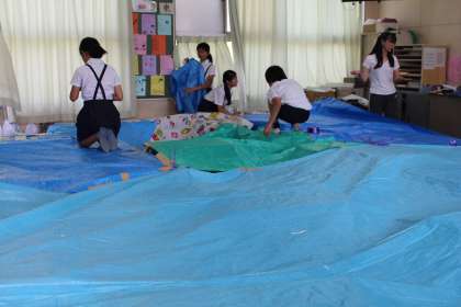 明日にひかえた「ひよしワクワクフェスティバル」。今日の5時間目に最後のベストフレンド班活動をして、会場準備にとりかかりました。会場になる教室は、ランドセルも廊下に避難です。ゲームの道具作りや飾り付けなど、1年生から6年生までが一緒になって最終準備をしました。