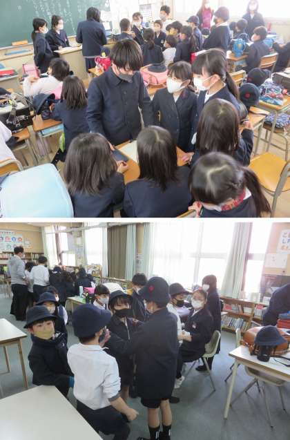 コロナ禍になり、集団登校をするのも難しい面が出てきましたが、日吉小では伝統的に6年生が班長になり、近くの子どもたちを連れて集団登校をしています。