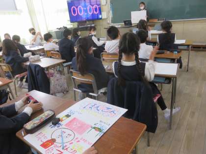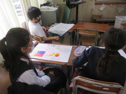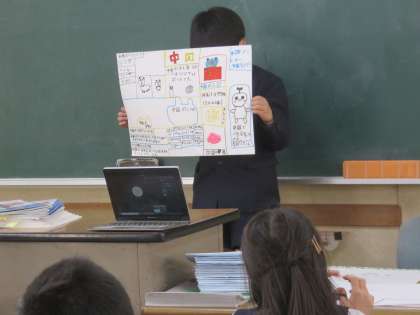 3年生が、総合の時間を使って、国を一つ決めて調べたことをみんなの前で発表していました。