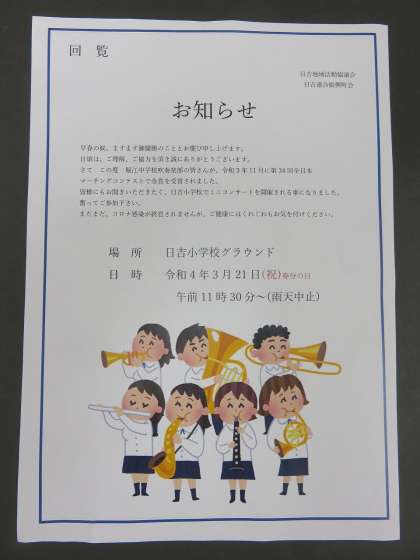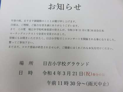 3月21日(月)『春分の日』に、堀江中学校吹奏楽部の皆さんが日吉小のグラウンドでミニコンサートを開催するそうです。