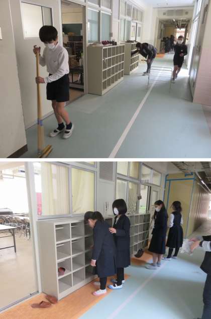 講堂は、いすなどをすべて出してから拭き掃除をして、いすを入れ直しました。