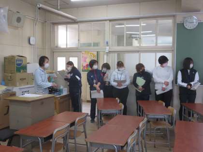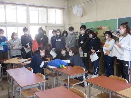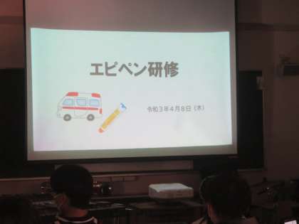 はじめに、食物アレルギーなどでのアナフィラキシーショックが起こった時の対応や、エピペンの使い方、てんかん発作の対応などについて学びました。その後、教室での緊急対応の実地訓練を行いました。