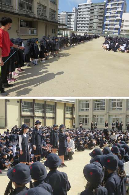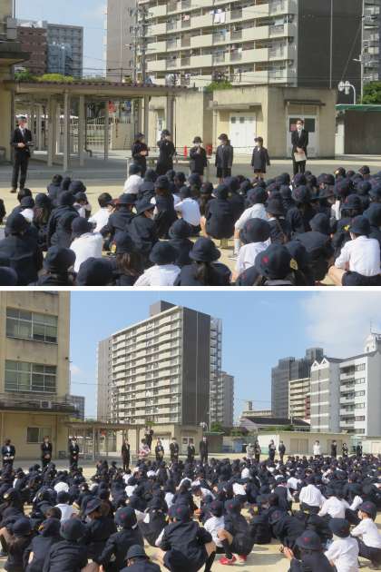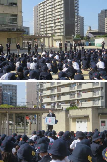集団登校では、新しい班長が、1年生の手をつないで登校してきてくれました。