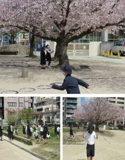 運動場でさっそくおにごっこをしているクラスもあれば、教科書やいろいろなプリントを配っているクラスもありました。
