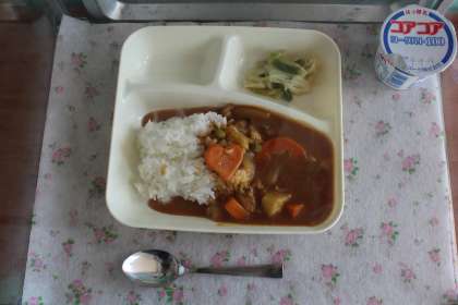 今日は、チキンカレーライスの日。栄養士さんと給食調理員さんが、お楽しみを作ってくれました。