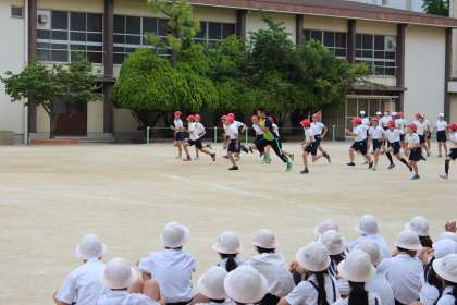 実技講習は、軽くランニングの後、腕の振り方、足の上げ方の指導を受けました。短距離走では、横一列になって一緒に競走していただきましたが、一瞬で6年生は離されてしまいました。見ていた4、5年生からも「うわ〜」という感嘆の声。本物の速さを目の当たりに見ました。