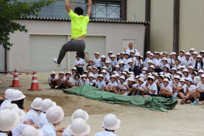 最後に、荒川選手に、走り幅跳びを見せていただきましたが、小学校の砂場がちっぽけで申し訳ないと思われるほど、かなり手前で踏み切られました。ふわあっと空を舞う、大きな跳躍。トップアスリートの素晴らしさを見せていただきました。