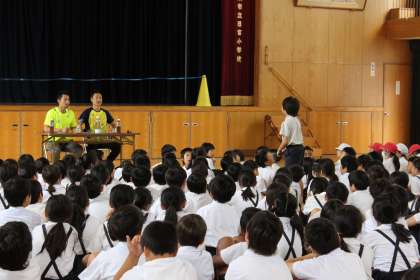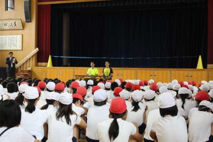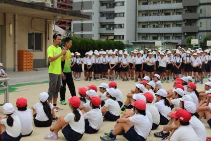 日吉小学校に来ていただいたアスリートの方は、日本のトップレベルの方々で、世界陸上にも出場の、走り幅跳びの荒川大輔選手と、十種競技の宮川洋也選手です。
