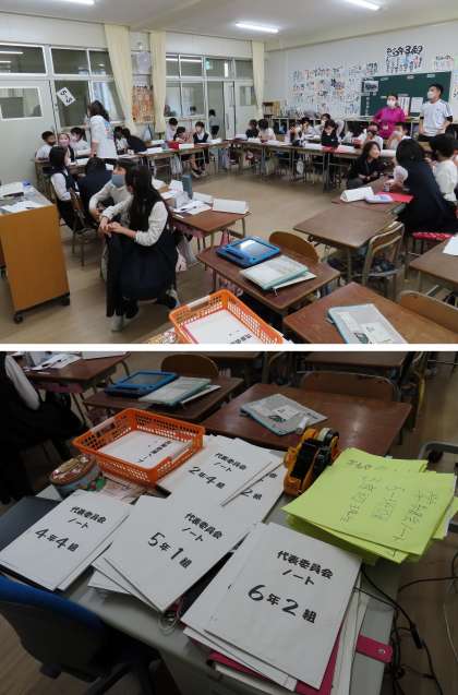 各クラスからの意見が代表委員会ノートに書きこまれ、それを黒板に出し合って考えていきました。