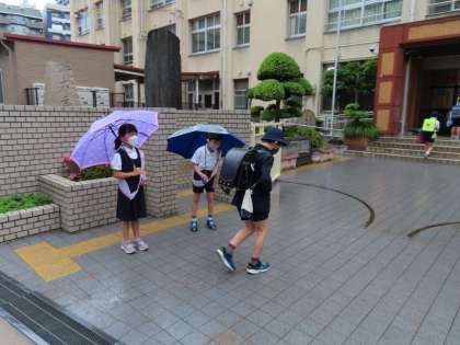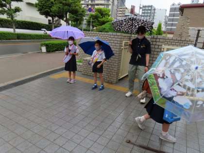 その中で子どもたち(学級であいさつをする係を決めたそうです。)も雨のなかあいさつを呼びかけてくれていたので、写真を撮っておきました。
