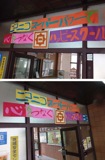 玄関には、今年の学校目標『ニコニコスーパーパワーで 心をつなぐ ハッピースクール日吉』が掲示されました。