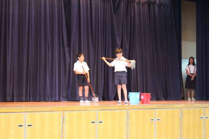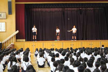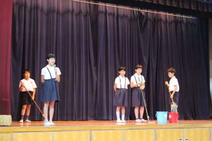今日の児童集会は、環境委員会が、道具の使い方など、掃除のときの注意事項をみんなに伝えました。