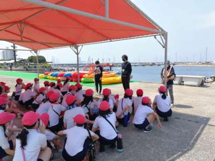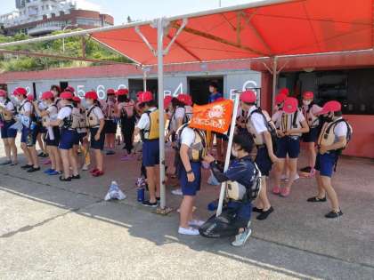 救命胴衣をつけ、カッターに乗る準備をしています。
