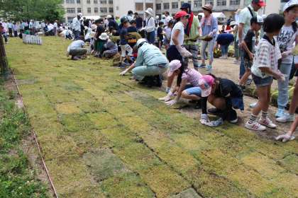 園芸業者の方の説明を受けて作業を始めましたが、要領をつかんだ子どもたちは、地域の方々と一緒に積みあがった苗をみるみるうちに敷き詰めていき、早々にすべてを完了させました。