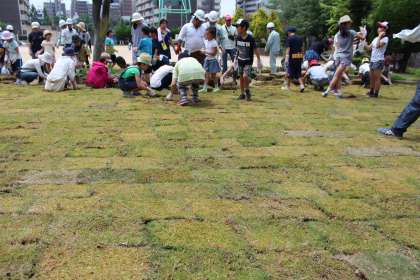 これから芝の管理をすすめていくことになりますが、地に根付き、青々としてくるころは、ちょうど運動会のころでしょうか。心和む場所になるよう、大事に育てていかなければと思います。