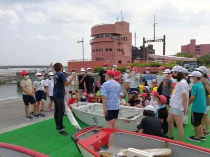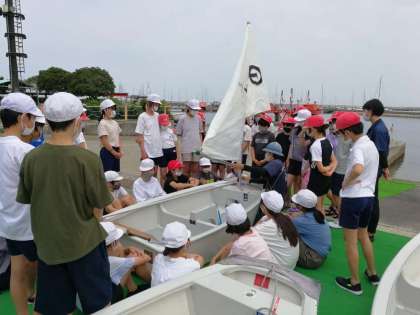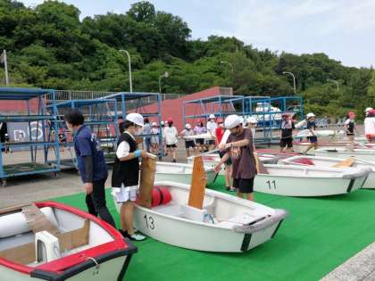 ヨットの組み立て方をスタッフの方に、教えてもらっています。