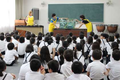 1年生から6年生までの読み聞かせを6月9日から始めていただいていますが、この日は、5年生向けに、清掃前のお昼の休憩時間、多目的室で活動いただきました。学齢に合った本に、マリンバの効果音も入って、集まったたくさんの子どもたちは静かに聞き入っていました。