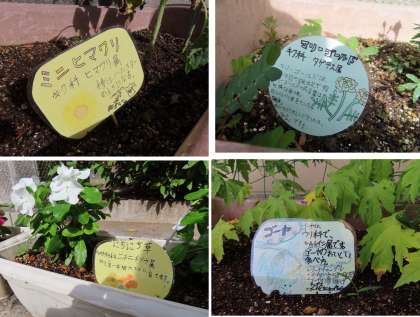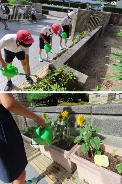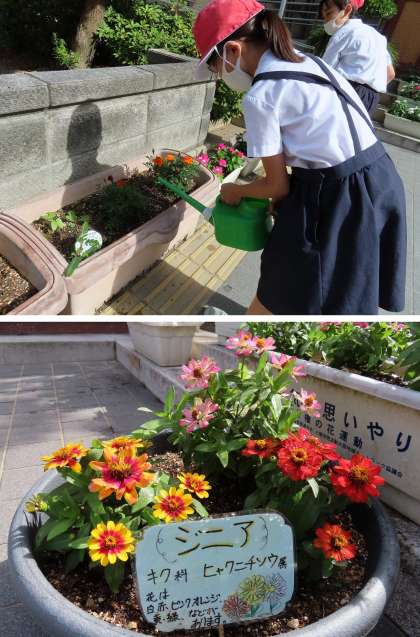 栽培委員会の子どもたちが、毎朝、玄関の花に水をあげています。