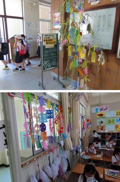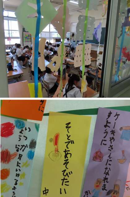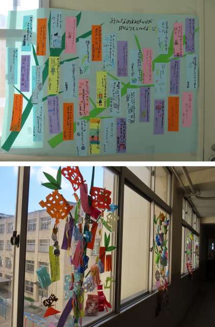 学校には、玄関のなかよし学級の笹飾りをはじめ、いろいろなところに子どもたちのお願いごとが短冊に書かれています。