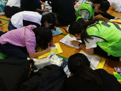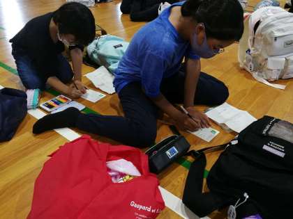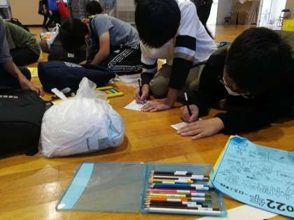 お風呂の順番を待っている間、体育館でハガキを書きました。