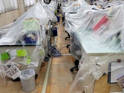 職員室の先生用のパソコンに繋がっている電源とLANケーブルの配線工事を行っています。現在はパソコン用の電源とLANの配線をコードカバーで覆っているため床に凹凸がどうしてもあります。また、LANケーブルはパソコンを移動できるように余裕を持たせています。現状では、床の配線などに気を付けながら職員室の中を移動しなくてはなりません。
