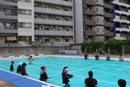 外部の先生に講師として来ていただいて、学校のプールで、低学年・中学年・高学年の別に、子どもたちが遊びの中でいつのまにか水になじむ指導の方法や、クロールや平泳ぎの指導のポイントなどの手ほどきを受けました。