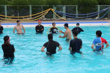 曇り空で肌寒い気候でしたが、日吉の子どもたちの水泳学習に取り入れようと、プールサイドでもプールのなかでも、先生たちは熱心に実技指導を受けていました。