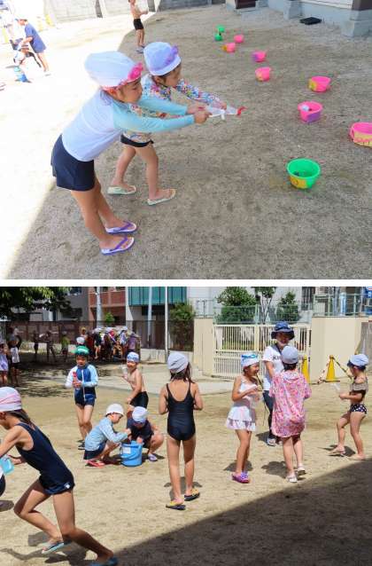 最初は、容器に水を入れて、的をねらっていましたが・・だんだんと友だち同士でかけ合う子も増え出しました。