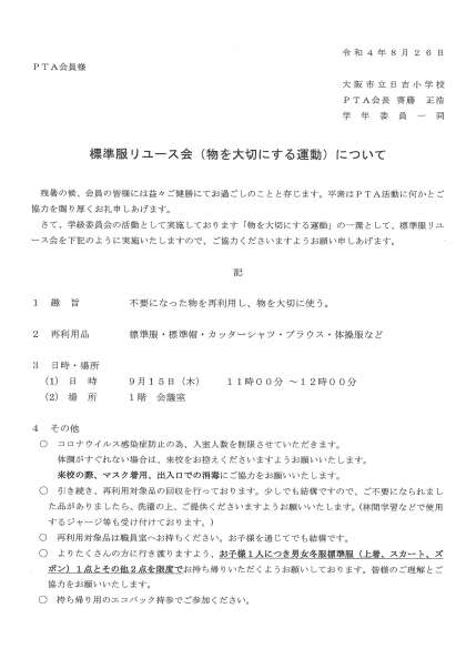 標準服リユース会を実施いたします。日程は、以下の通りです。