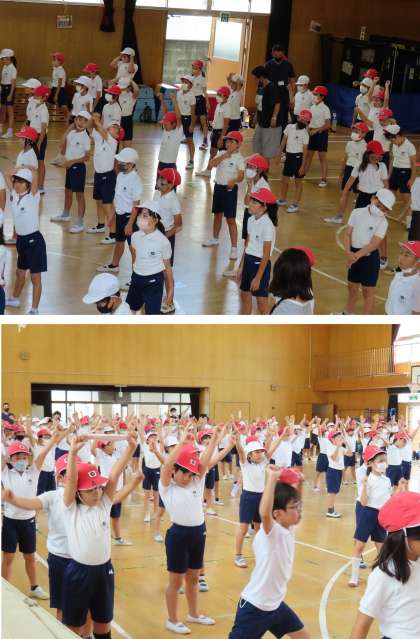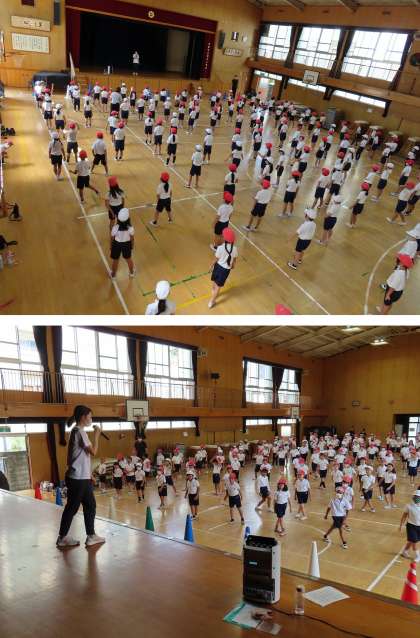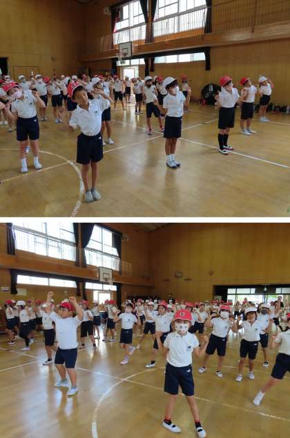 4時間目、3年生が講堂で運動会のダンスの練習をしていました。