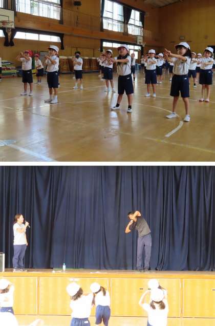 舞台に立つ先生の動きを一つ一つまねて、練習をしていました。