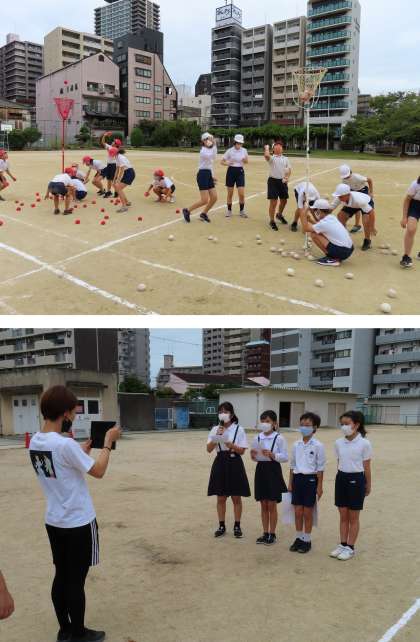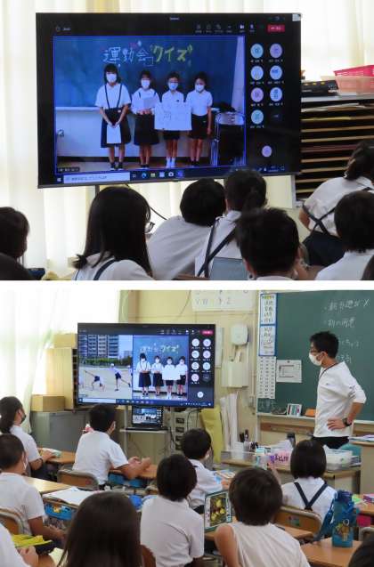 集会委員の子どもたちが運動場で実際にクイズを出し、それを各教室で見て答えるようにしました。