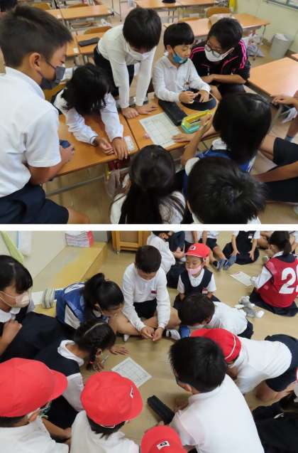 集会委員会の子どもたちが、放送室から秋の言葉を言って、それをそれぞれの教室でベストフレンド班ごとに○をつけていきます。