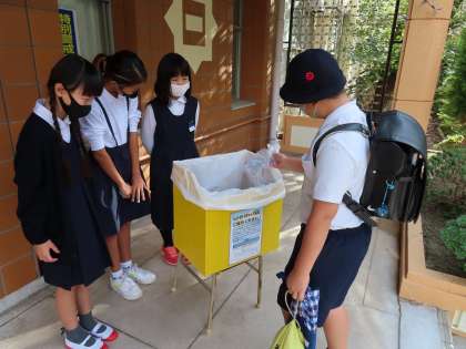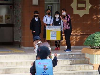 全校児童の呼びかけて、朝の登校の時に回収箱に入れてもらっています。