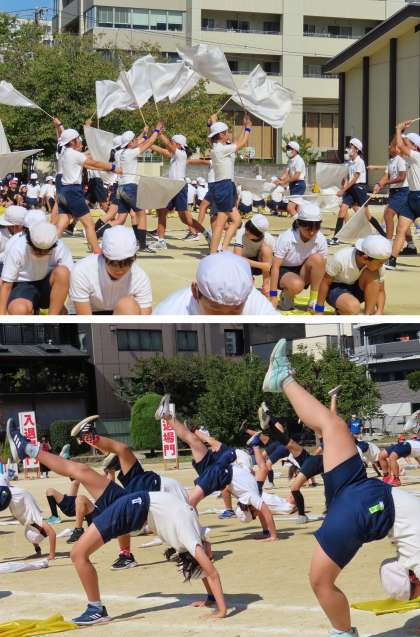 フラッグの演技と一人組の組体操・・