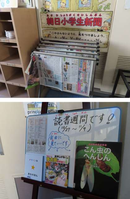 図書室からおもしろそうな本を借りて、校長室前に置いています。
