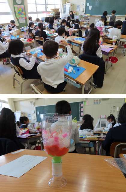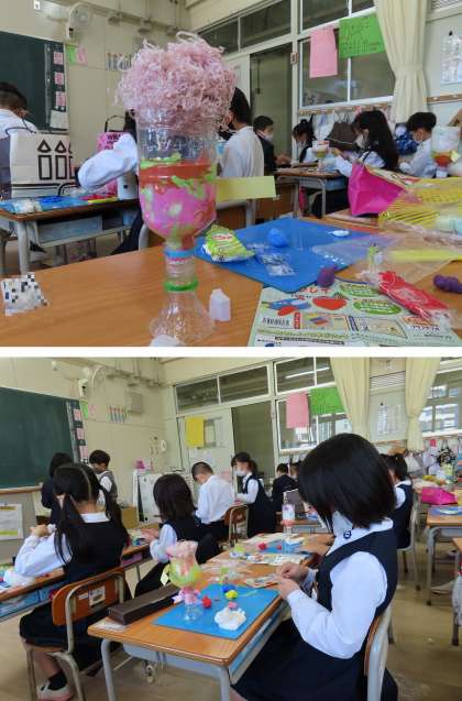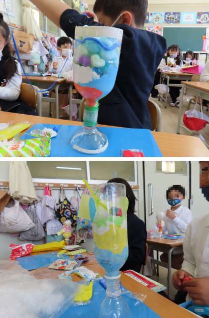 ペットボトルを使ってワイングラスを作り、その中に、色とりどりの作品をつめこみ、『夢のワイングラス』としました。